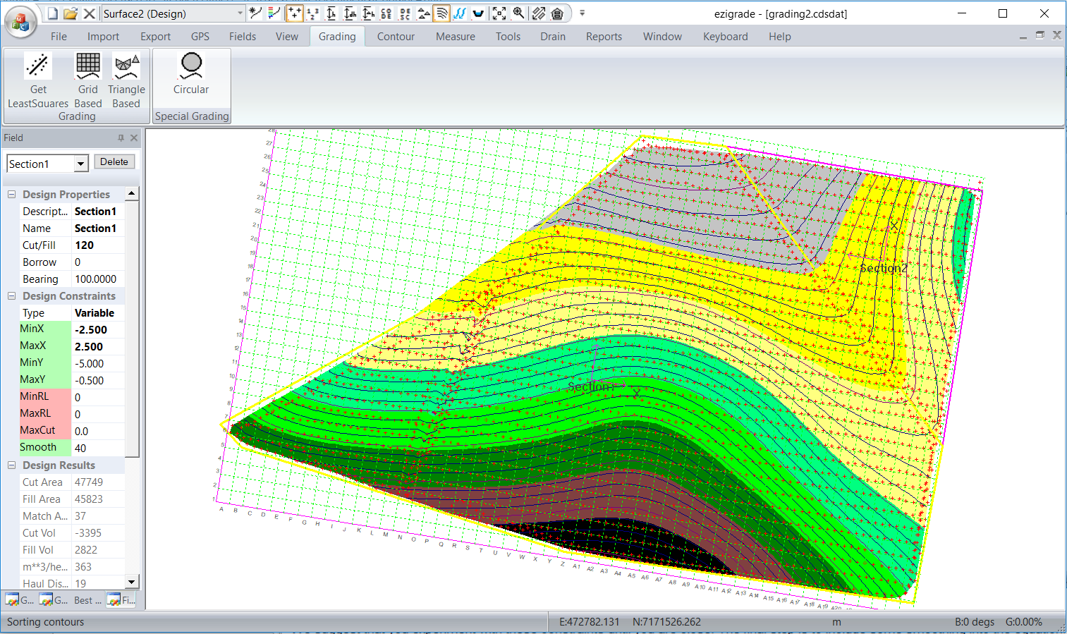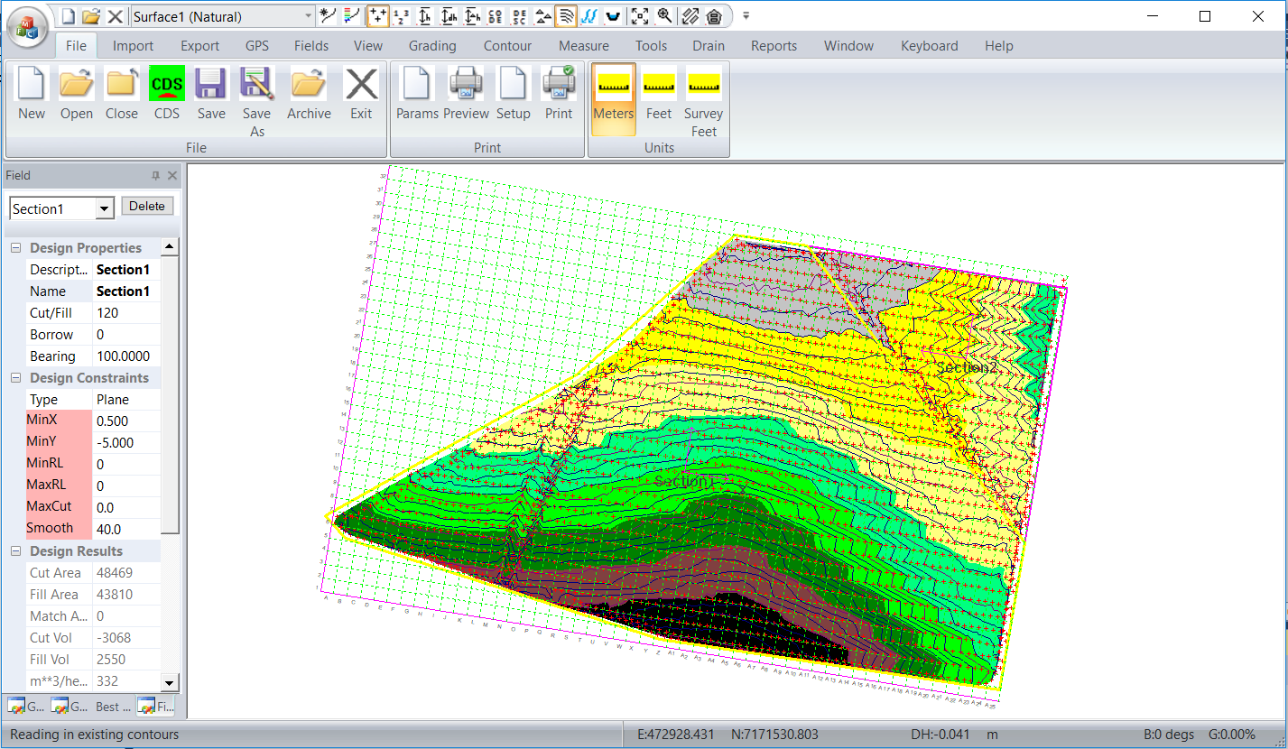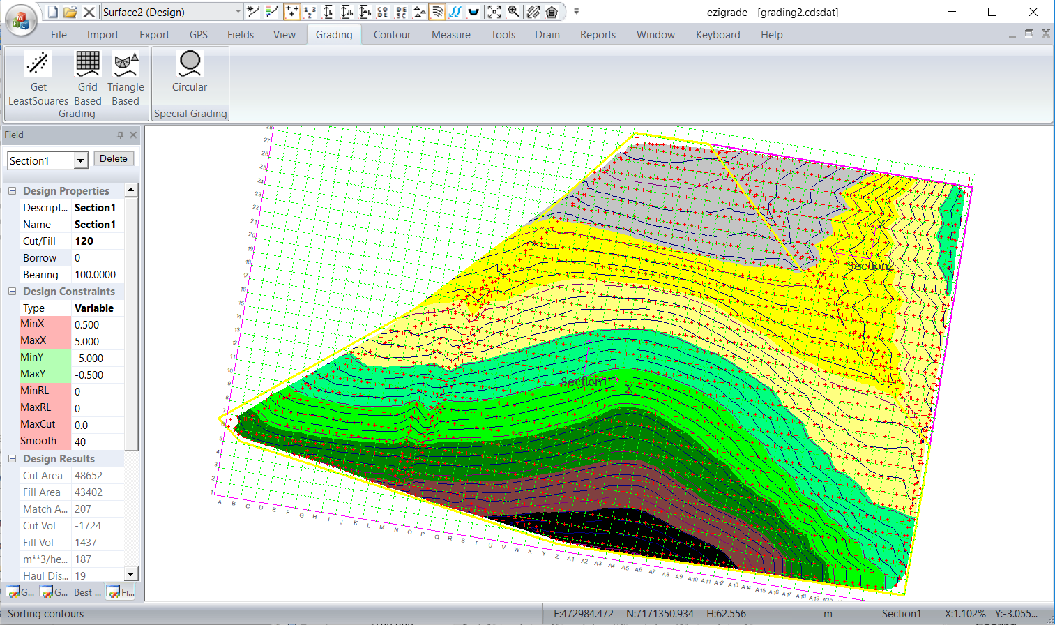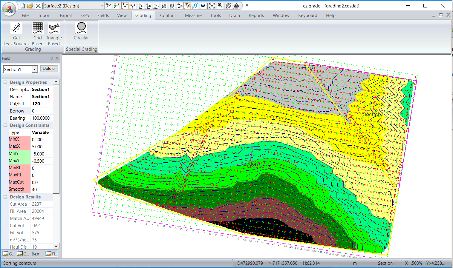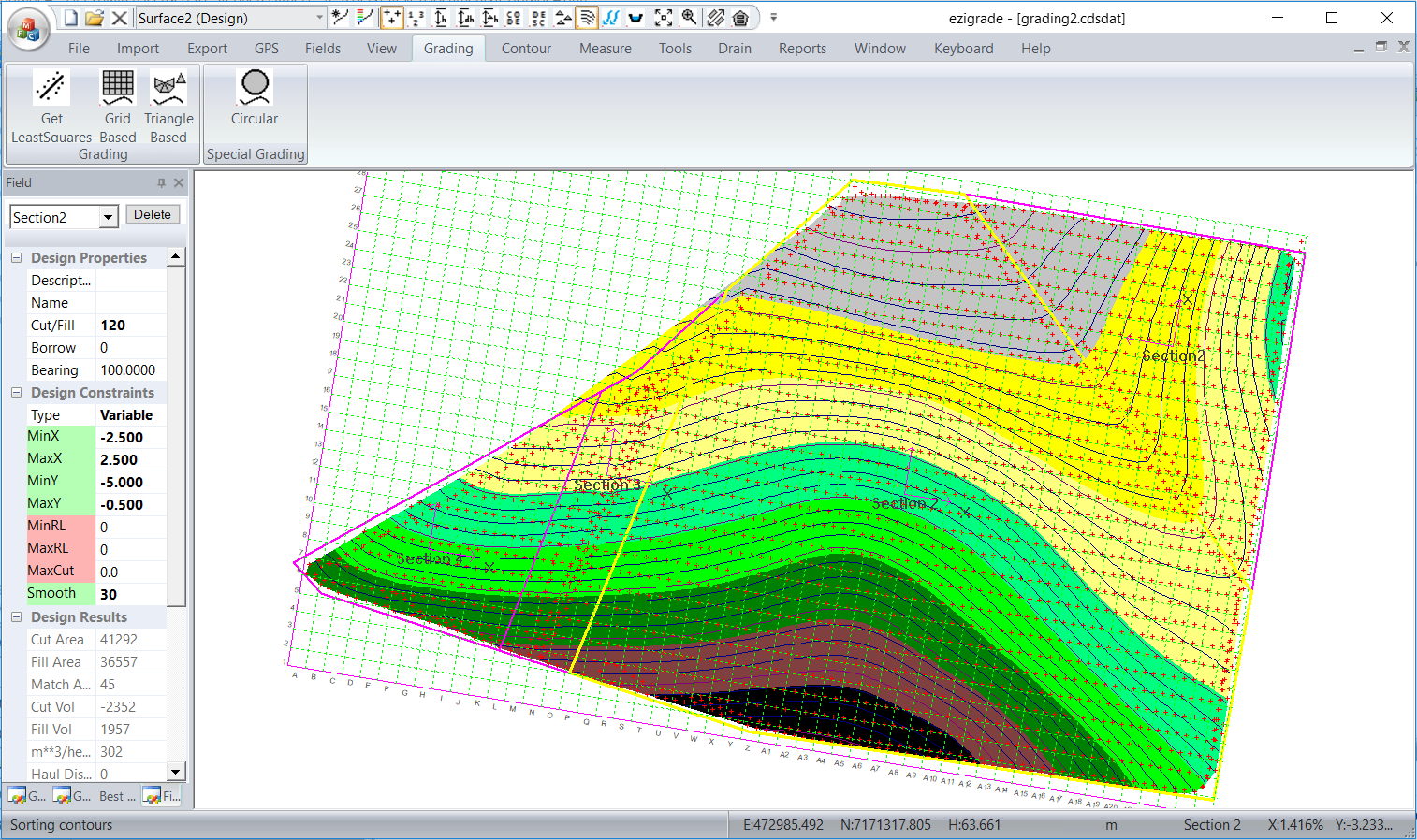 Lets compare what we get with the triangle based solution. Running Grading -> Triangle Based gives us the following. You will notice that the result is generally more wavy and there are a couple of issues around the section line between section1 and section2. The cut fill volumes are -691/575 respectively which is significantly lower than the grid based solution. The grid based only picks up data that falls on the grid points so we tend to get a smoothing effect. The triangle based solution uses every triangle in the job so is more rigorous. In particular you will notice that the existing drain outline is still clearly visible. The grid based soltion has one advantage in that processing time is normally less as we are only using a subset of points.