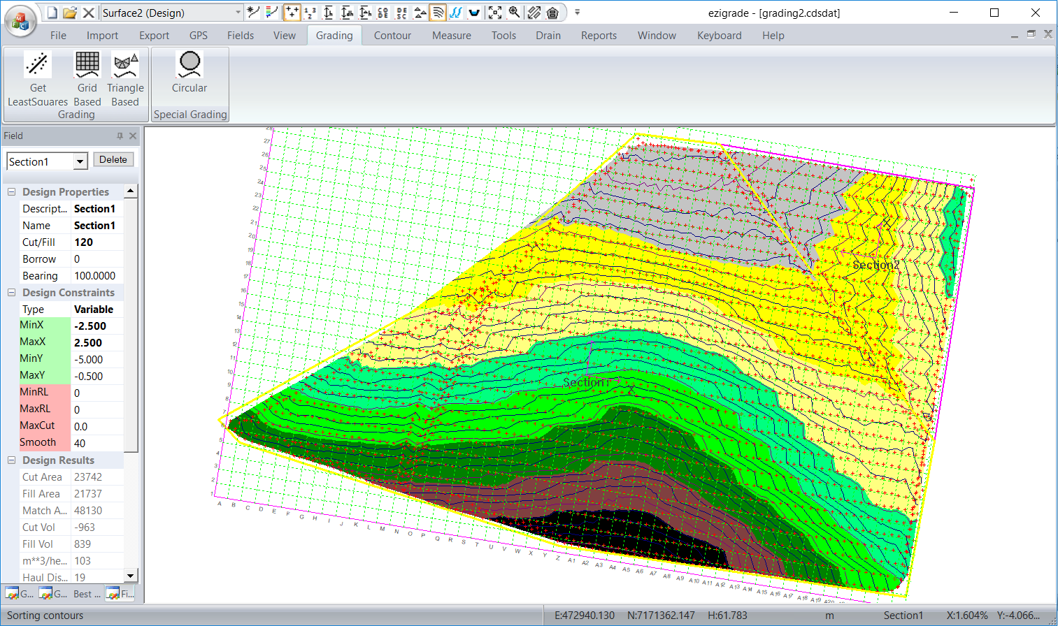 For a first solution we have clicked on the Grading -> Grid Based and used a grid size of 10m. We have the following and for reference the volumes for section1 are -1724/1437 for cut and fill respectively. You will notice that the existing drain is still visible and that particularly in section2 that the design is wavy.