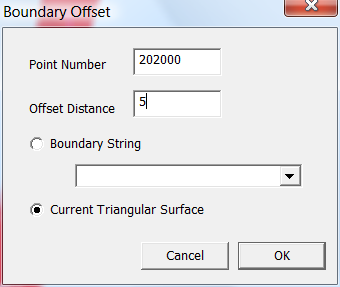 The point number sets the point number of points going into the database. You can make this bigger but not smaller. The offset distance needs to be set, and is the distance we want to offset the points. In the example we wish a new series of points 5m or feet from the edge of the existing triangles.
