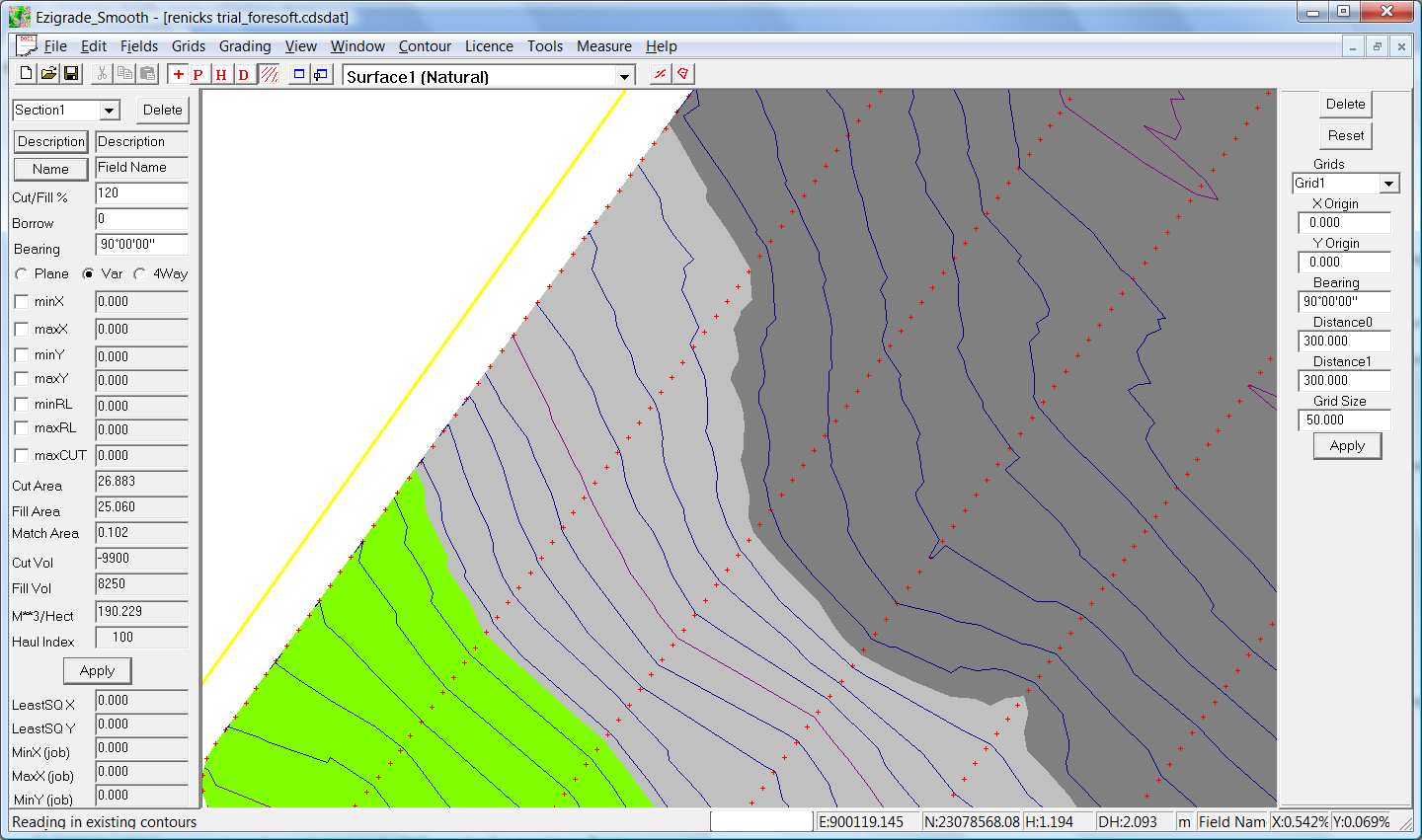 The job below shows an example that is suitable to be reduced. You will notice that each row is approximately 30 meters apart but each point has been picked up at a 3 meter interval. Picking up the points this close together doesn't give us anymore information on what is happening between the rows. In this job we had about 30,000 points which is big enough to increase the processing time when doing triangle based grading calculations. In this job we can decrease the database size to 10,000 points without losing any practical accuracy. The processing speed is then fast enough to do everything in real time.