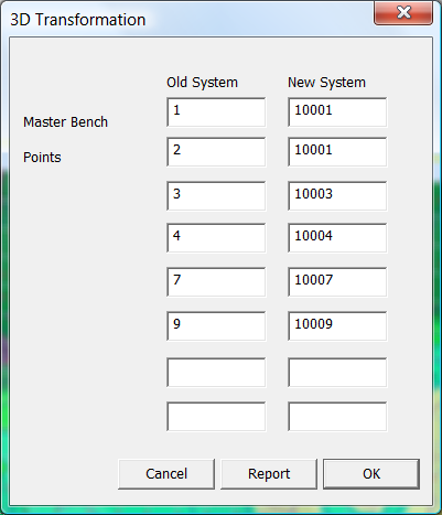 For the software to calculate the appropriate factors to apply we need to specify a series of points in the old coordinate system and there coordinates in the new system. From these coordinates we can calculate the appropriate coordinates to best fit these reference numbers. The rest of the points in the database are also transformed onto the new system.
