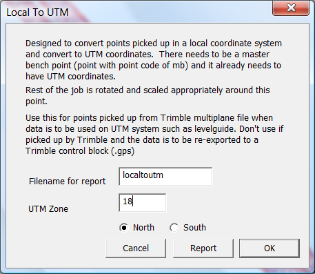 This function will convert points picked up in a local system to equivalent points based on UTM system. In particular this routine is suitable to convert points imported from a Multiplane text file, when we wish to put out the points to a UTM based farm system such as levelguide. If you wish to use the data in a local grid based system such as Trimble then DO NOT CONVERT THE DATA. You will introduce an unwanted swing in the data.