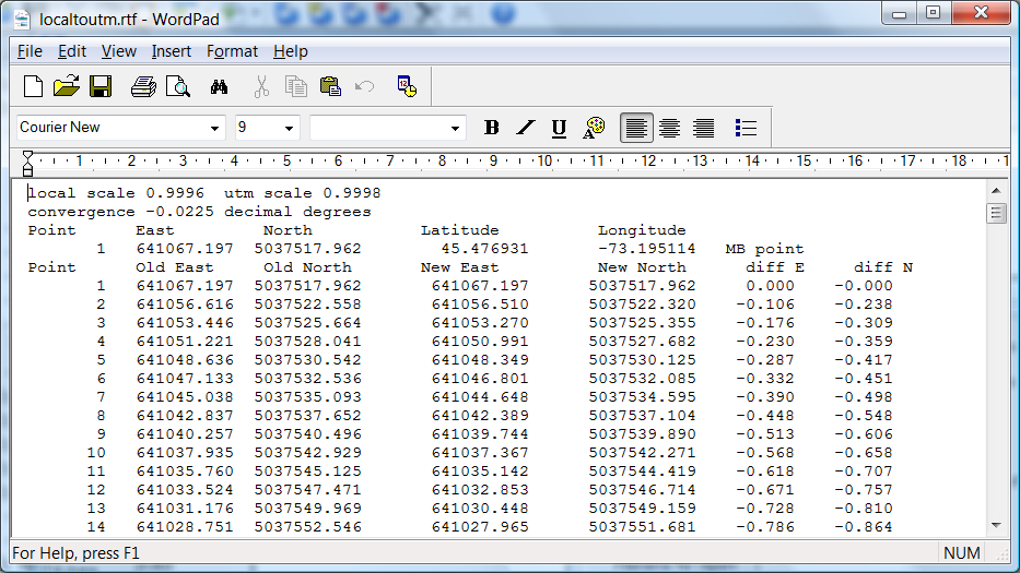 The first line shows scaling factor both before and after. The Convergence is shown in decimal degrees. This is how much the field is swung at the master bench point. For transverse Mercator projection there is no swing when field is at the middle of the zone. The closer you get to the zone edge and the further away from the poles then the larger the swing will be. The file is shown within notepad or whatever program that is registered by the windows operating system.