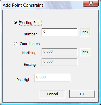 If you wish to enter a new point then click on the "Coordinates" radio button. Enter Northing and Easting, Design Height and press OK. If you want to click in a point, click on the "Pick" button to the right of "Northing". You can then click on the screen at the position you require. The dialog is then redisplayed and you can enter in the "Dsn Hgt" and press OK.