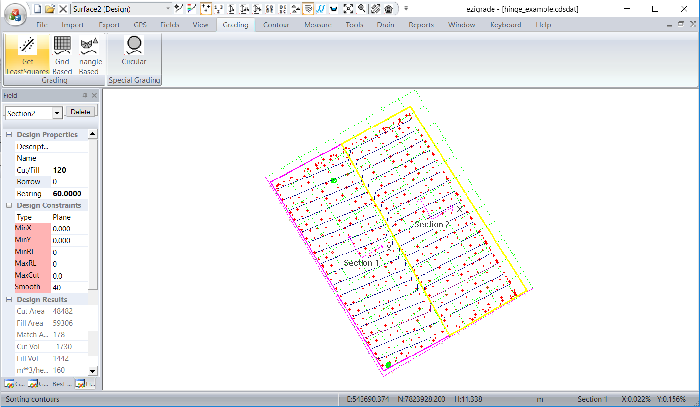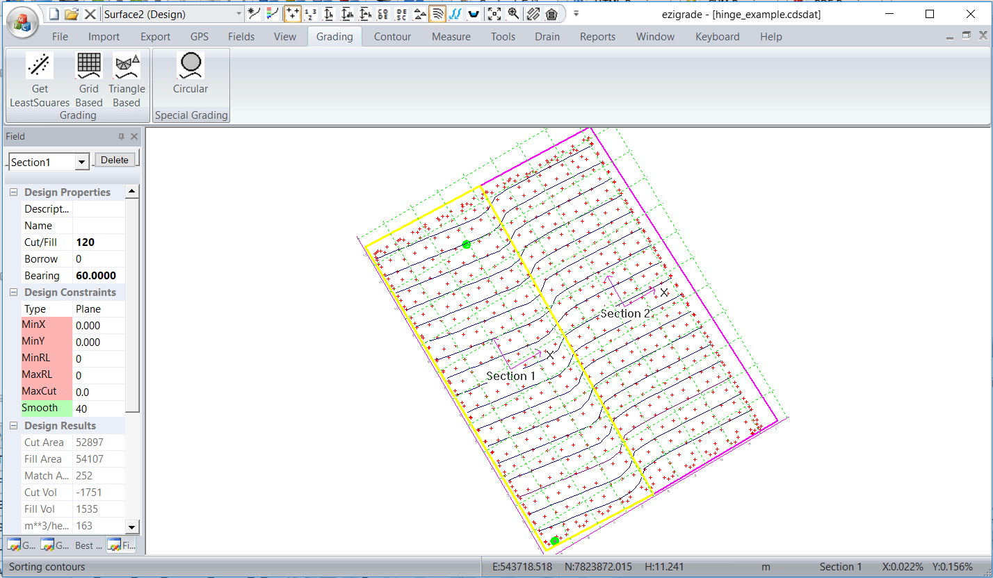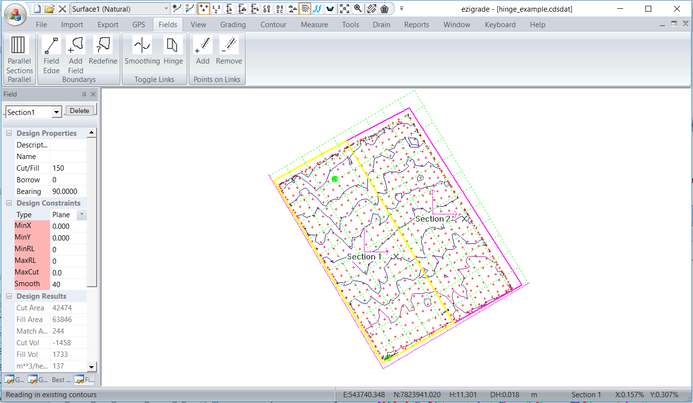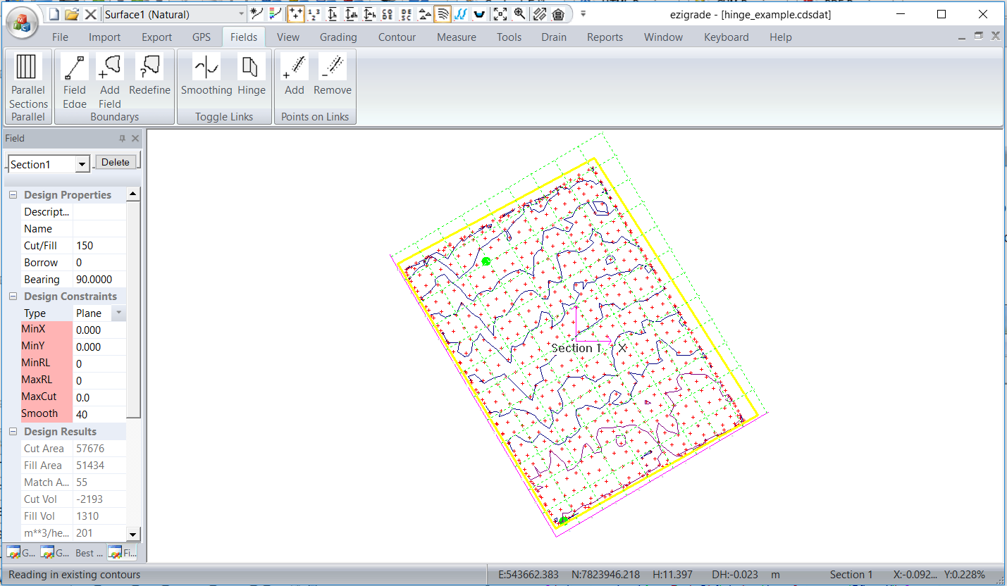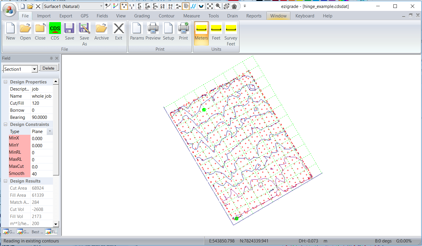Open Ezigrade , and then from the File - Open menu open up the "hinge_example.cdsdat" example. The natural surface will be displayed. We have already set the position of the grid. You can modify it by left clicking on it and moving and rotating using the grip points. In this example the water runs from the top of the job towards the bottom.
