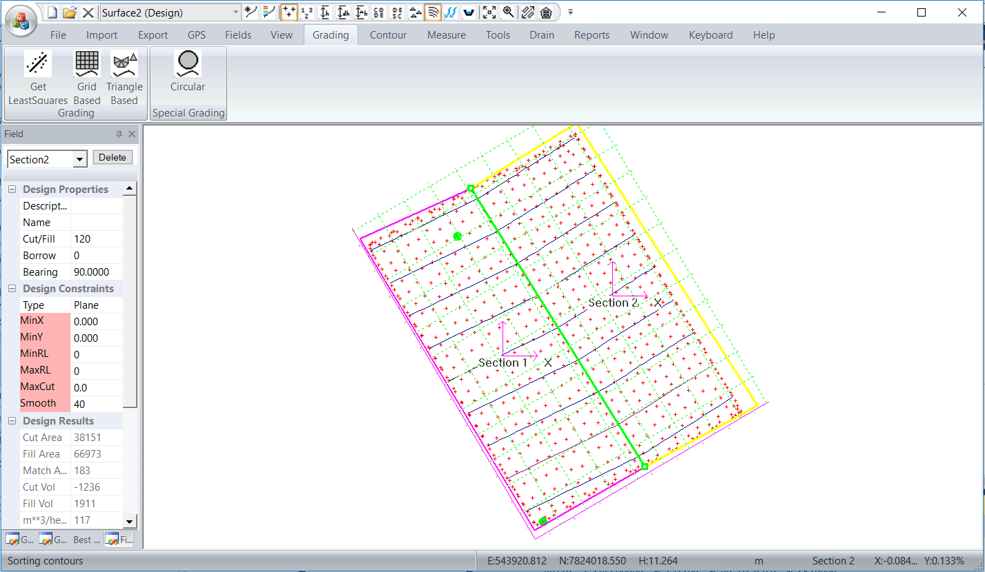 From the "Fields" menu click on the Fields -> Insert Field Edge. Draw a closed surface that encloses the whole job. Ezigrade will close the section if you finish by finishing on the start point. You need to hit the "Enter" key to finish the process. You should have something similar to that shown below:
