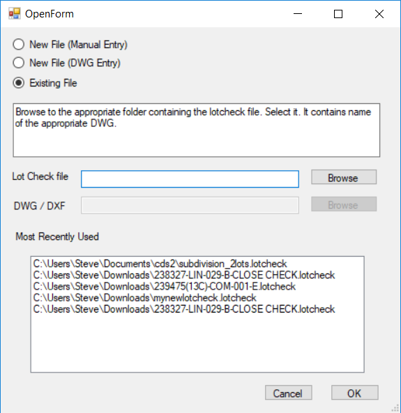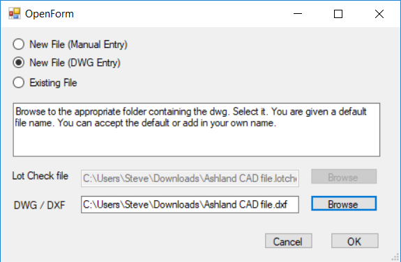 New File (DWG Entry) is to create a new lotcheck file and we are going to use a dwg file to click in values. You are prompted to browse to an existing dwg and a default lotcheck file is created which contains a link to the dwg file.