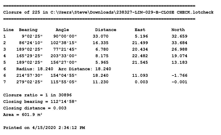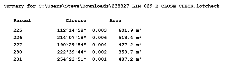 Once you have clicked in some coordinates; then we want to get a written account of all the miscloses and lot area's.
