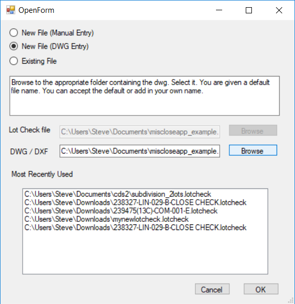 Now click on the OK button. MicloseApp creates a new file called miscloseapp_example.lotcheck. This file contains a link to the original DWG file.