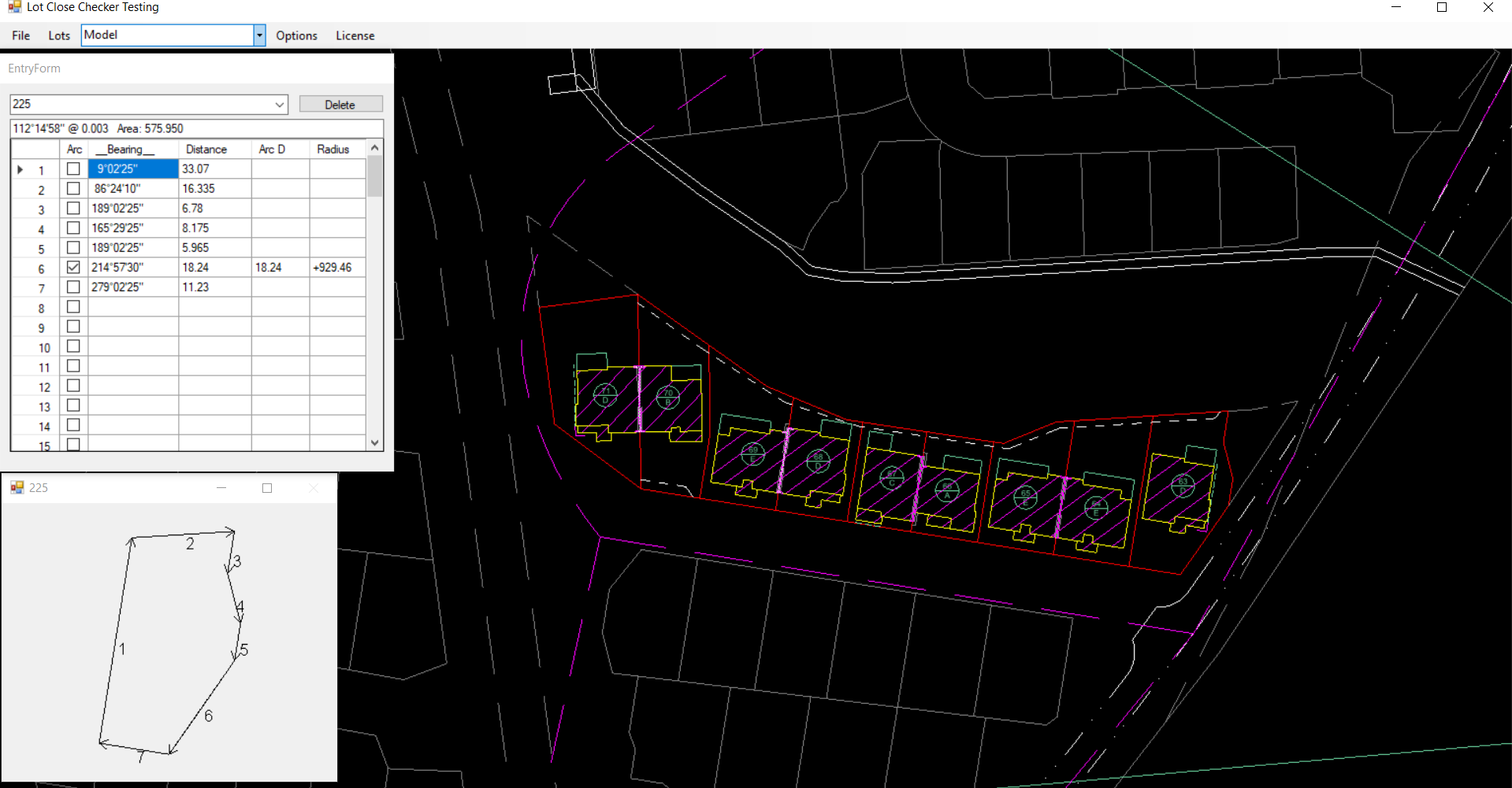 You can type c at anytime any the area, misclose distance and bearing are displayed. However when you do this we have an obvious problem. The LotDisplay dialog also shows an issue. You can see that line 5 is obviously heading in the wrong direction. When we clicked in these values we are assuming that we entered in a clockwise direction. So line 5 should be heading down the page. However the bearing shown is assuming we are looking up the page.