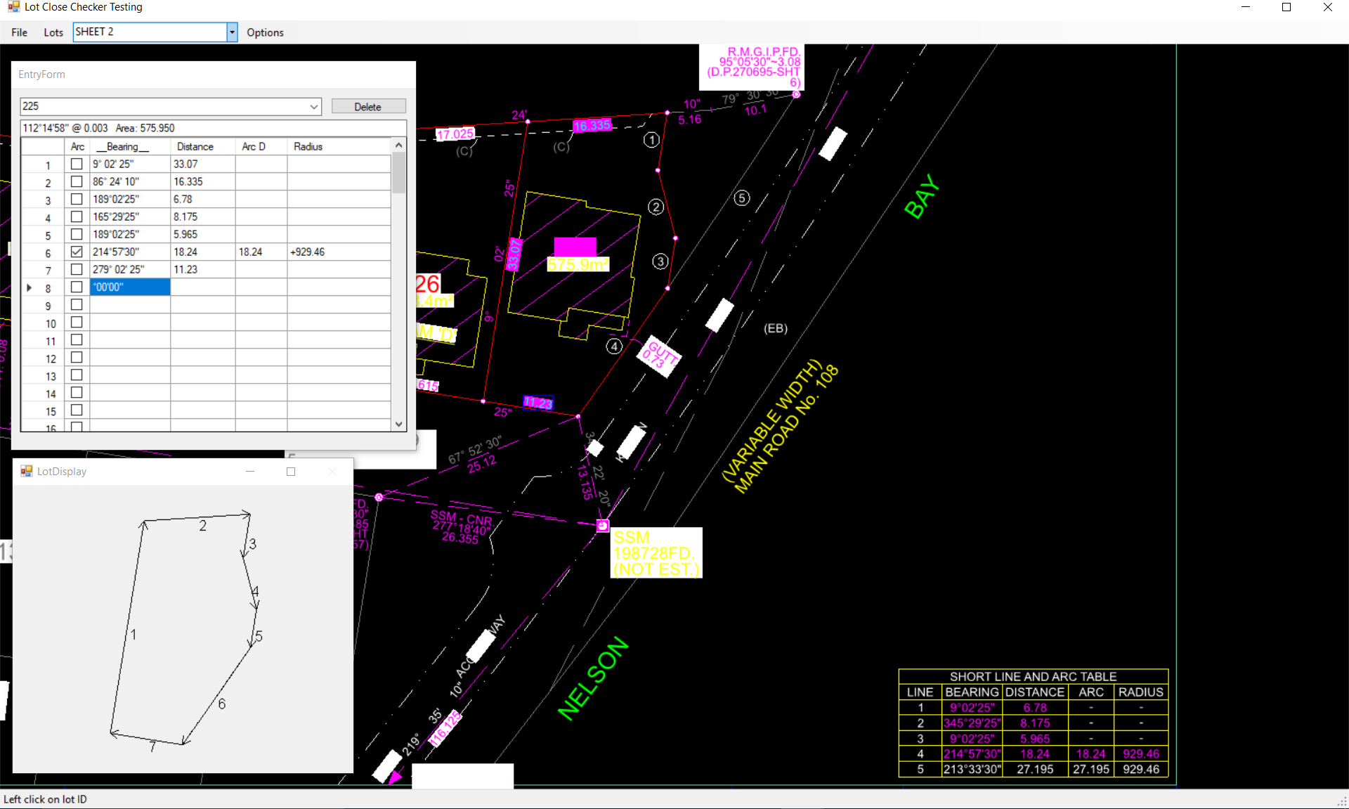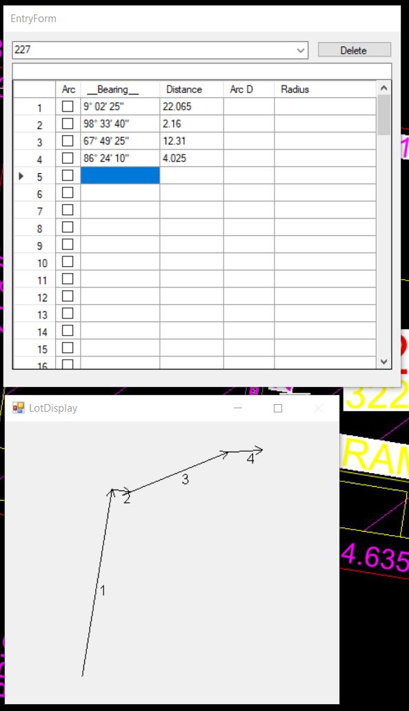 There are two ways of correcting this. We can click into the "EntryForm" at line 5 and bearing entry. When there hit the r key and the value is reversed. Alternatively simply click into the "LotDisplay" on the wrong line. It is automatically reversed and misclose is calculated.