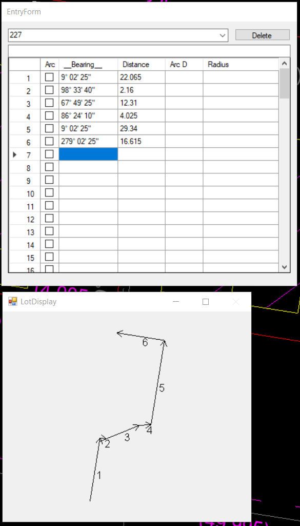 If we have an arc that is shallow then the "LotDisplay" will ask whether you are reversing the chord bearing or reversing the arc. Here is how we would enter Lot225 in the drawing below. Please note that we have clicked in some of the values from the short line and arc table.